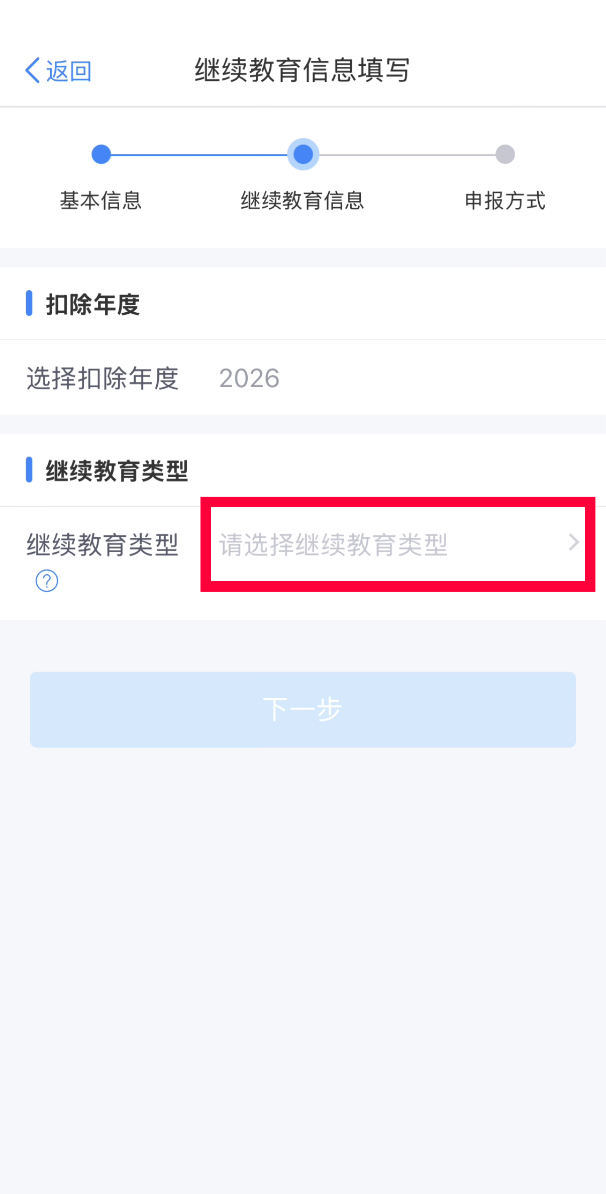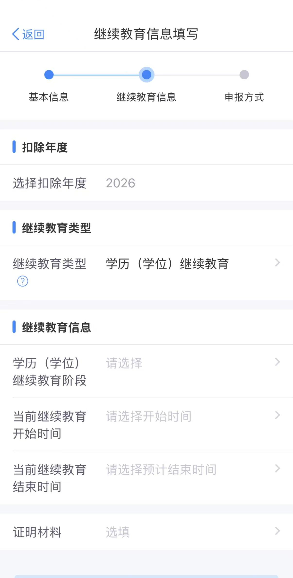 2.在专项附加扣除中选择“继续教育”,抵扣年份选2026,并点击“确认”。